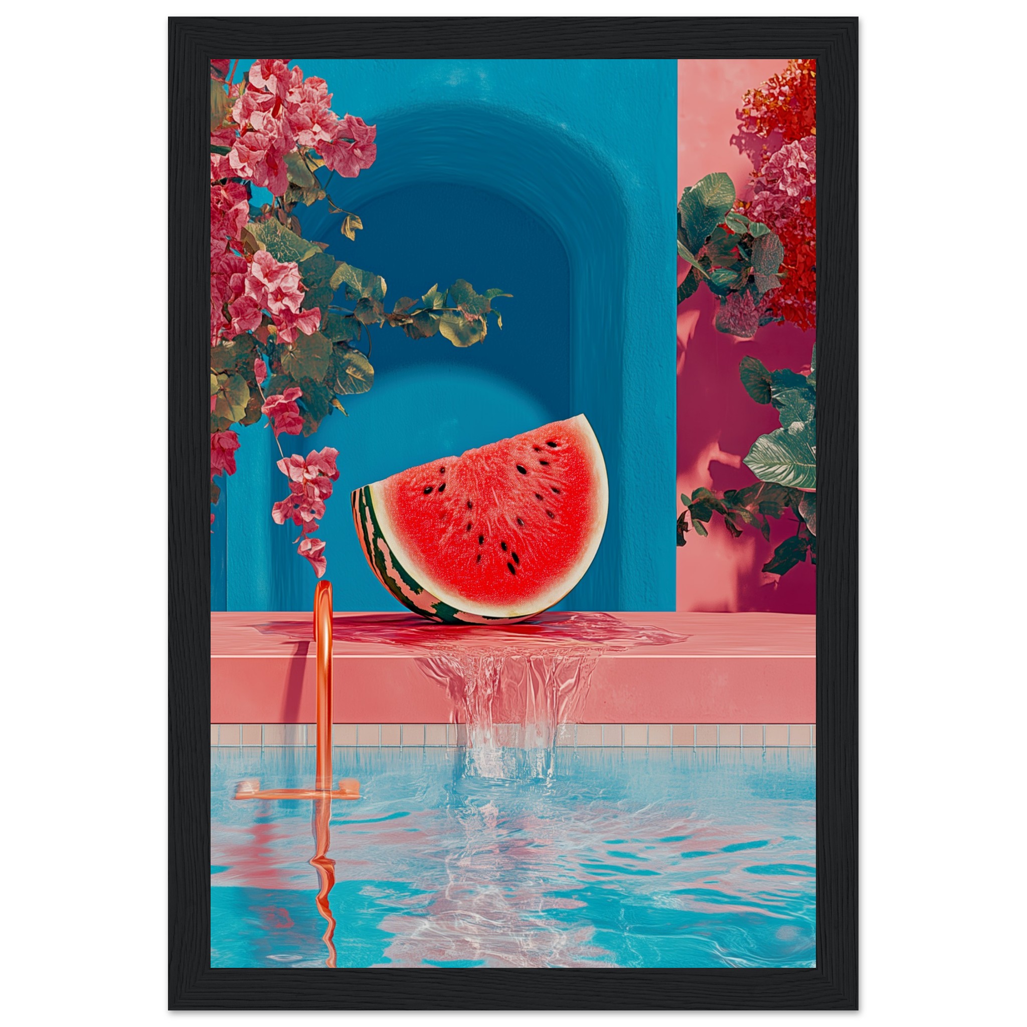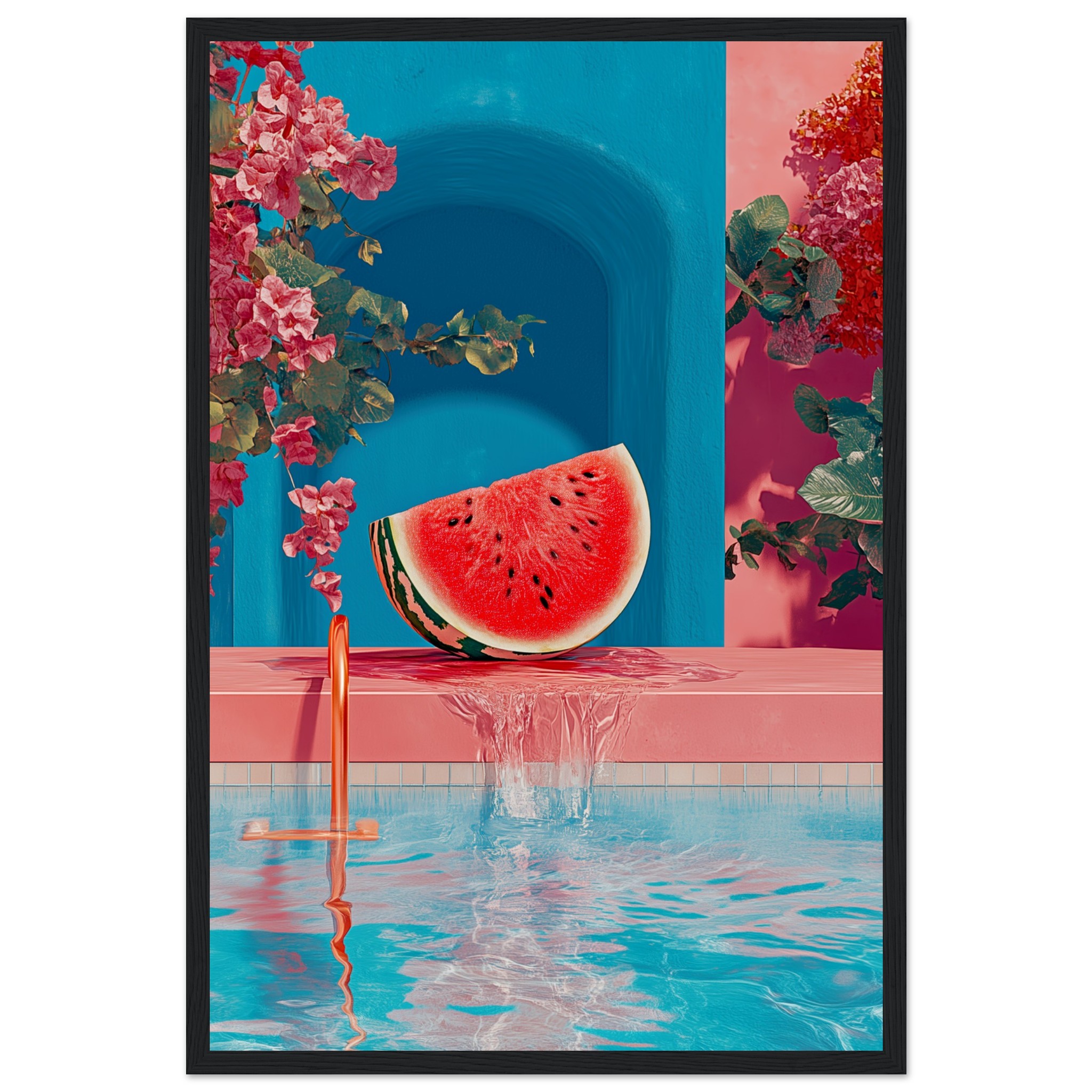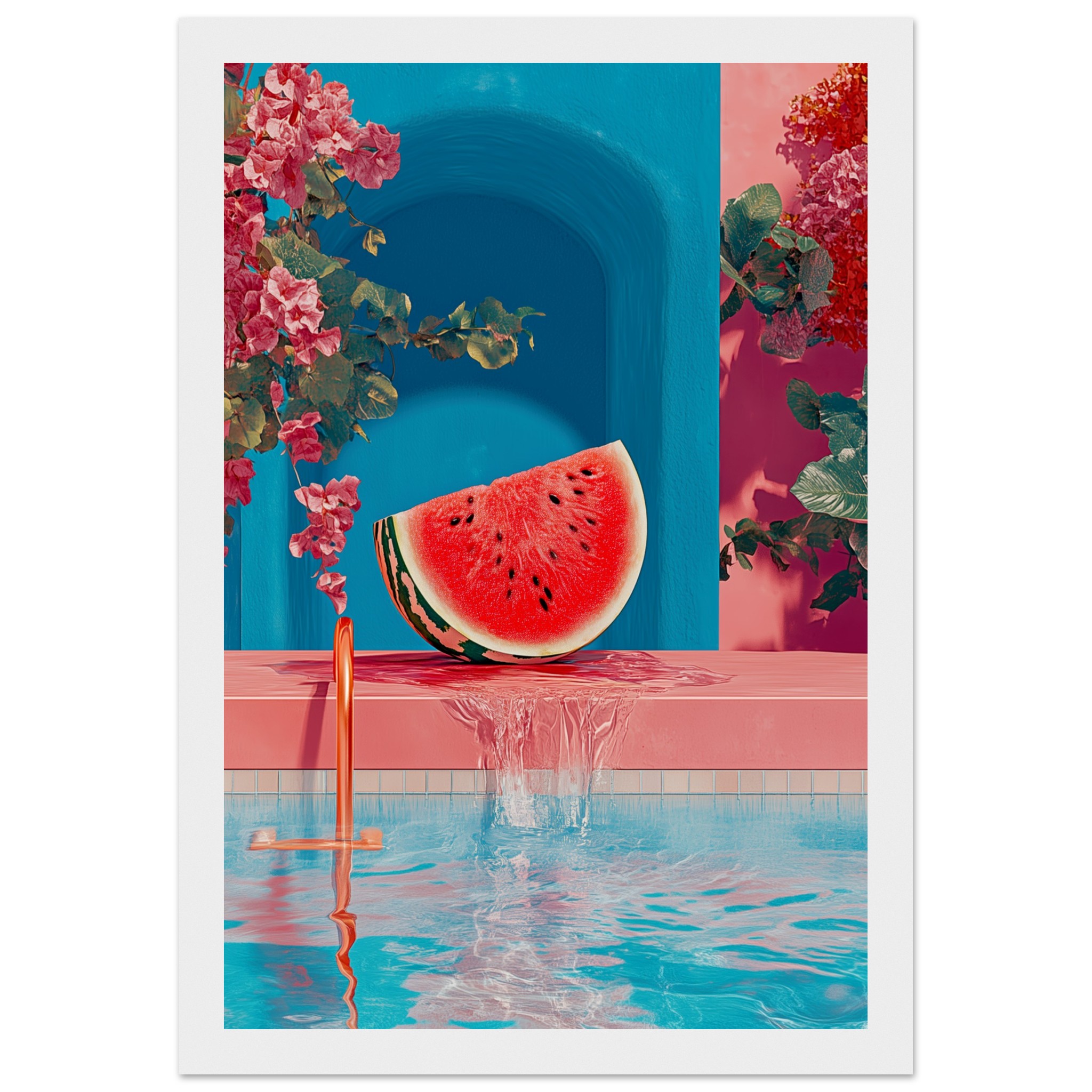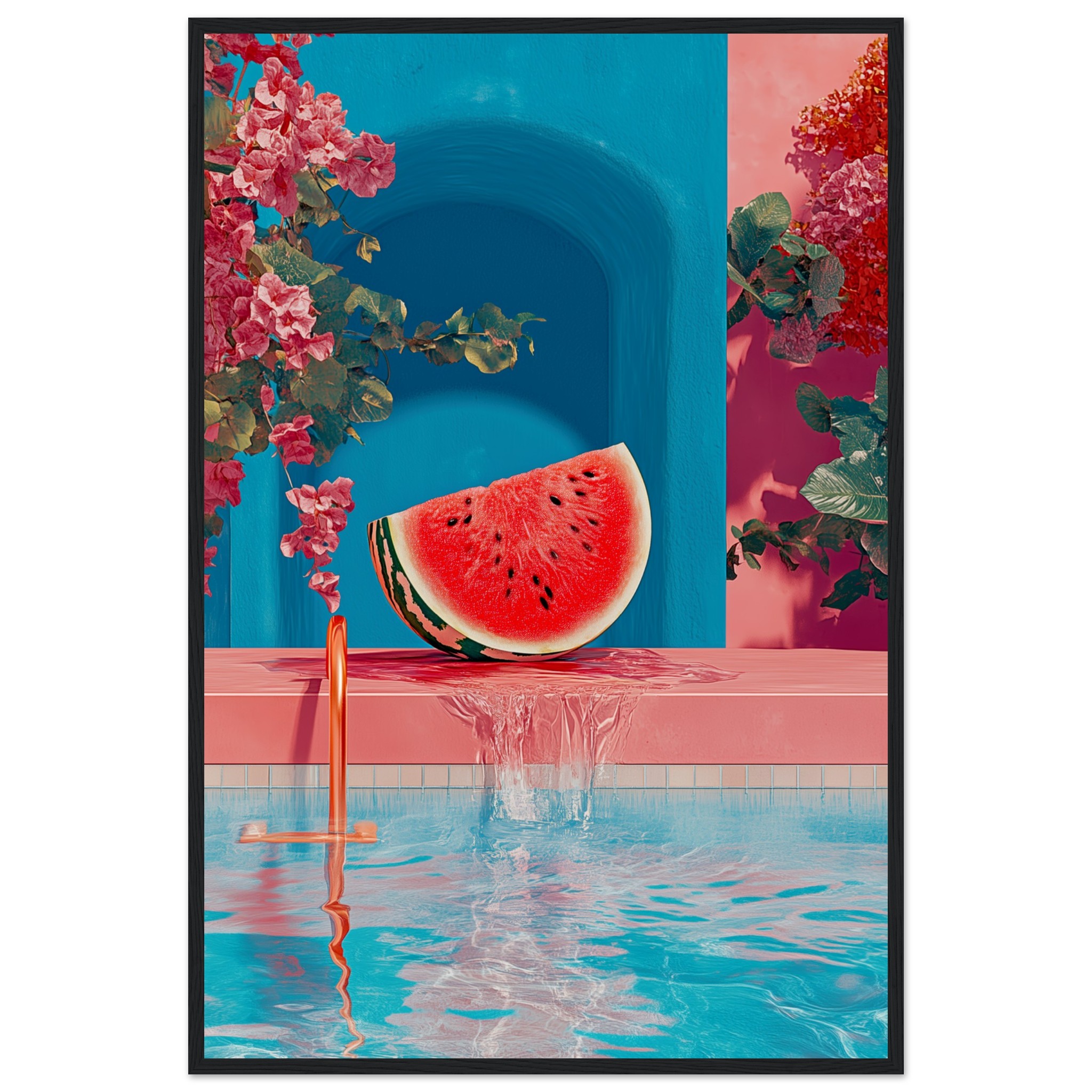 Bajo el sol ardiente, la sandía, vibrante y jugosa, se deshace lentamente, liberando su frescura en el agua. Cada gota que cae es un suspiro, un momento suspendido de puro deleite.