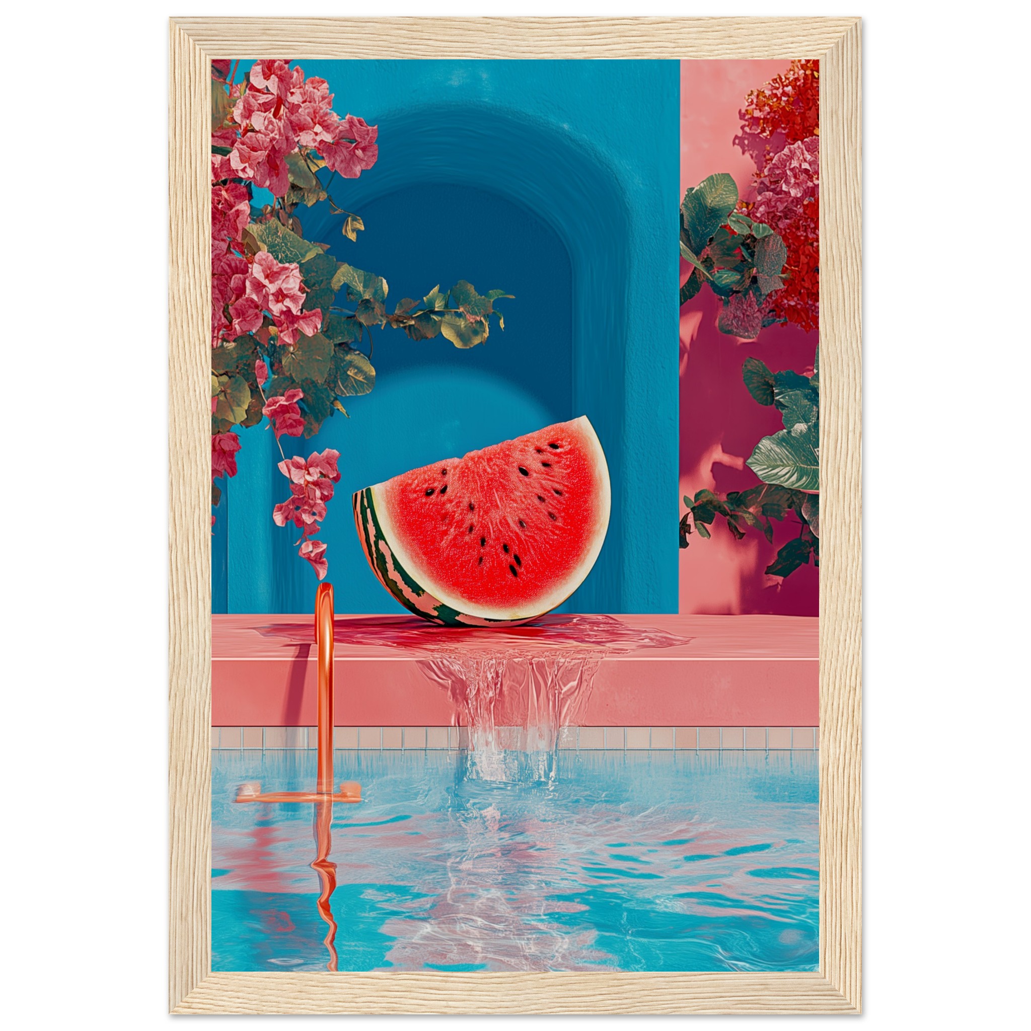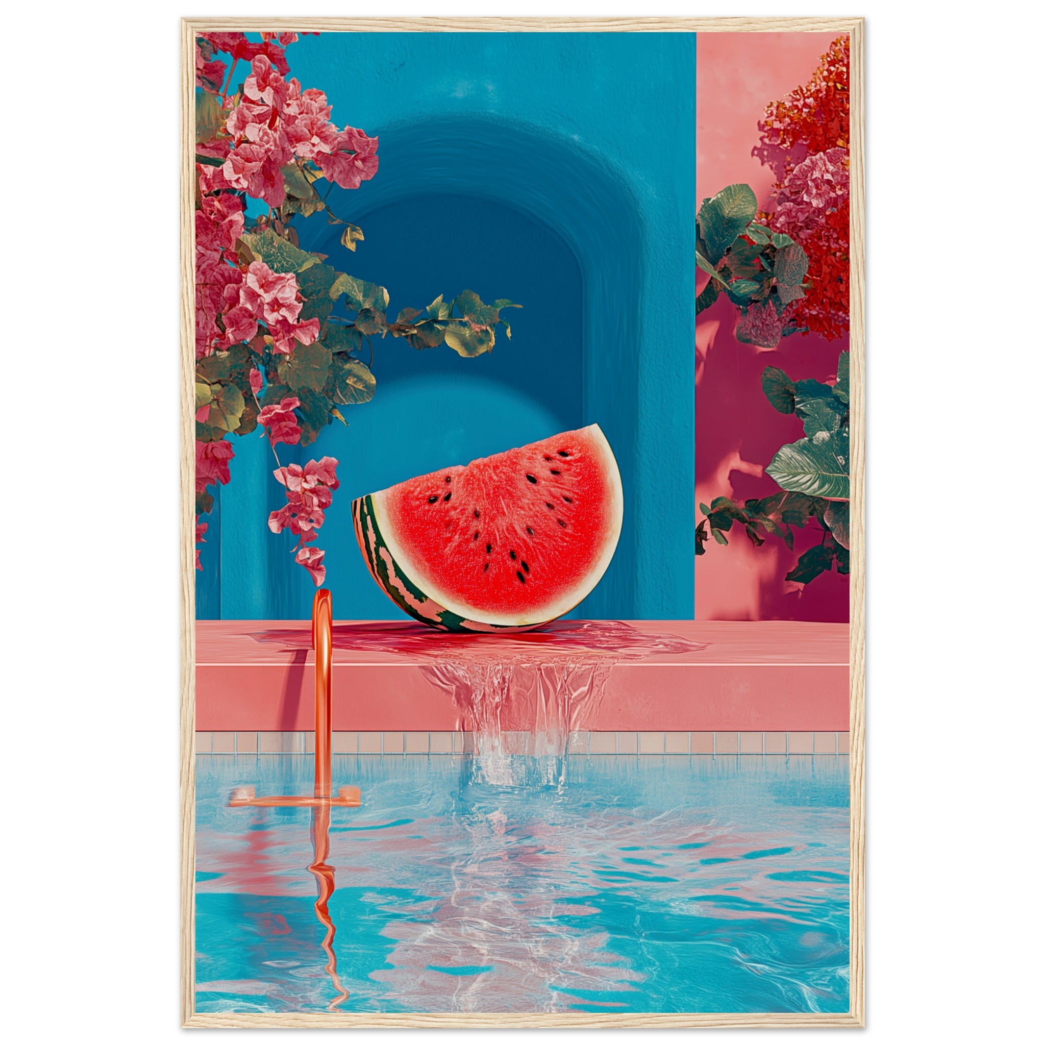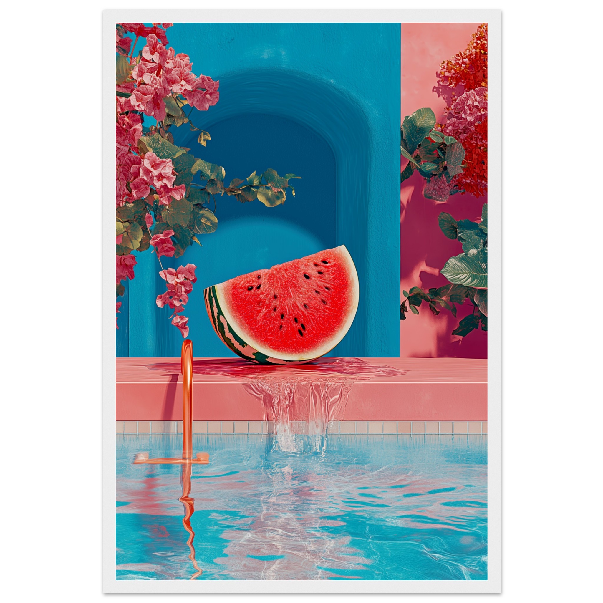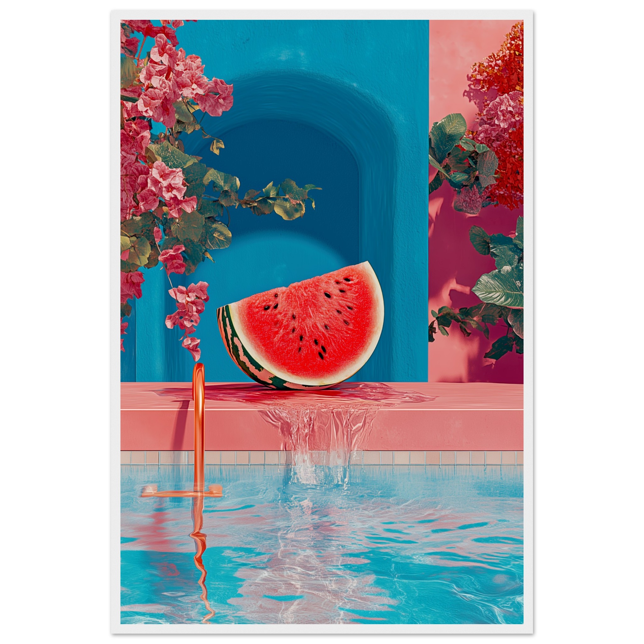Bajo el sol ardiente, la sandía, vibrante y jugosa, se deshace lentamente, liberando su frescura en el agua. Cada gota que cae es un suspiro, un momento suspendido de puro deleite.